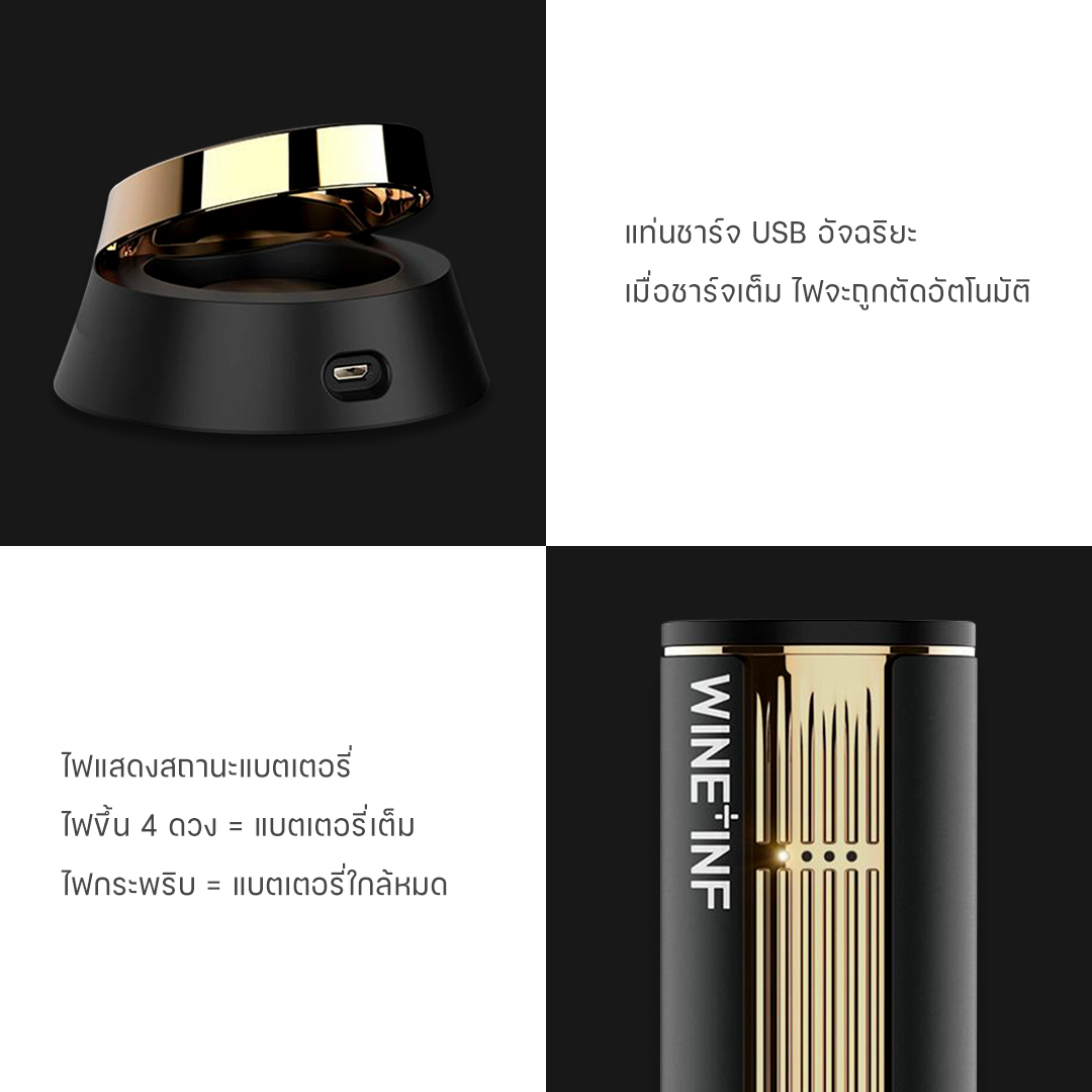 | อุปกรณ์ภายในกล่อง | ที่เปิดขวดไวน์ , ฐานชาร์จ , สายชาร์จ และคู่มือ |